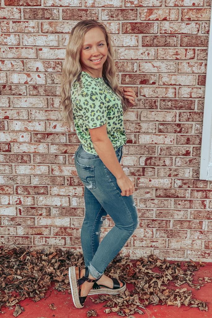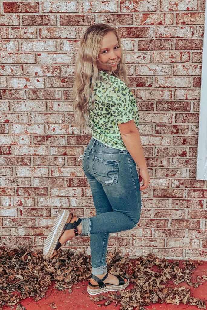 Green cheetah print t-shirt from Target: $14.99 (XS-XXL)| High waisted Skinny Jegging from American Eagle: $44.96 (ON SALE FOR 25% OFF!) | Sandals from Shoe Dept Encore (unfortunately they are no longer available but found great dupes at DSW for $39.99)