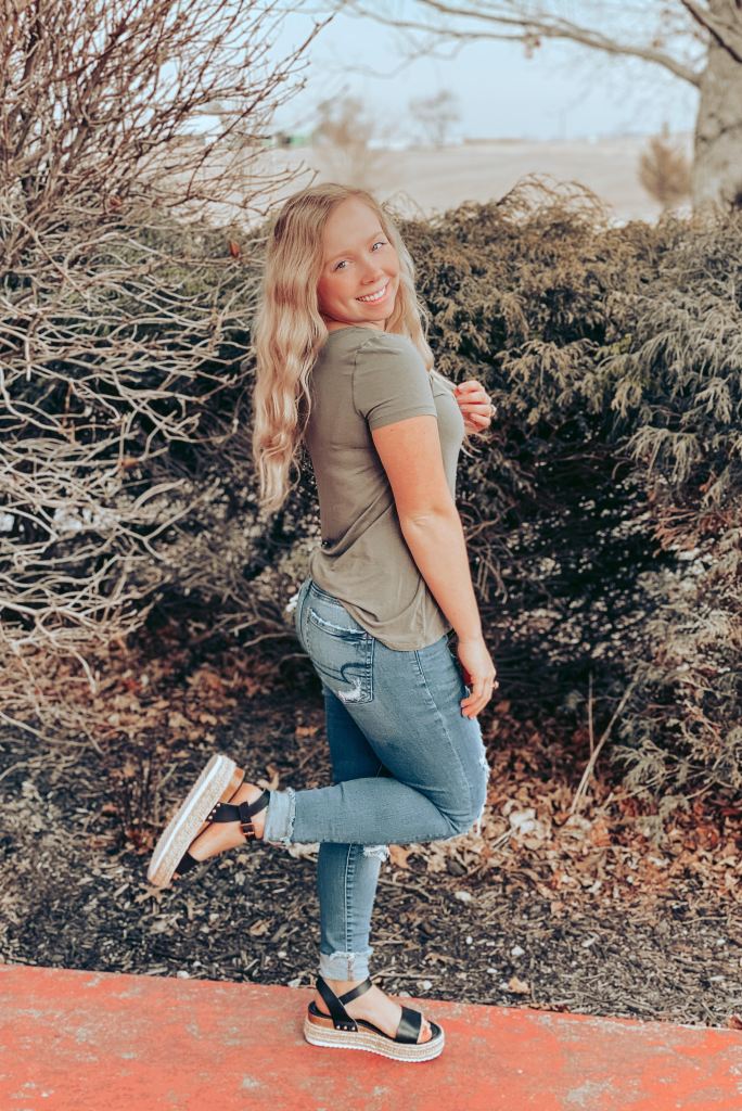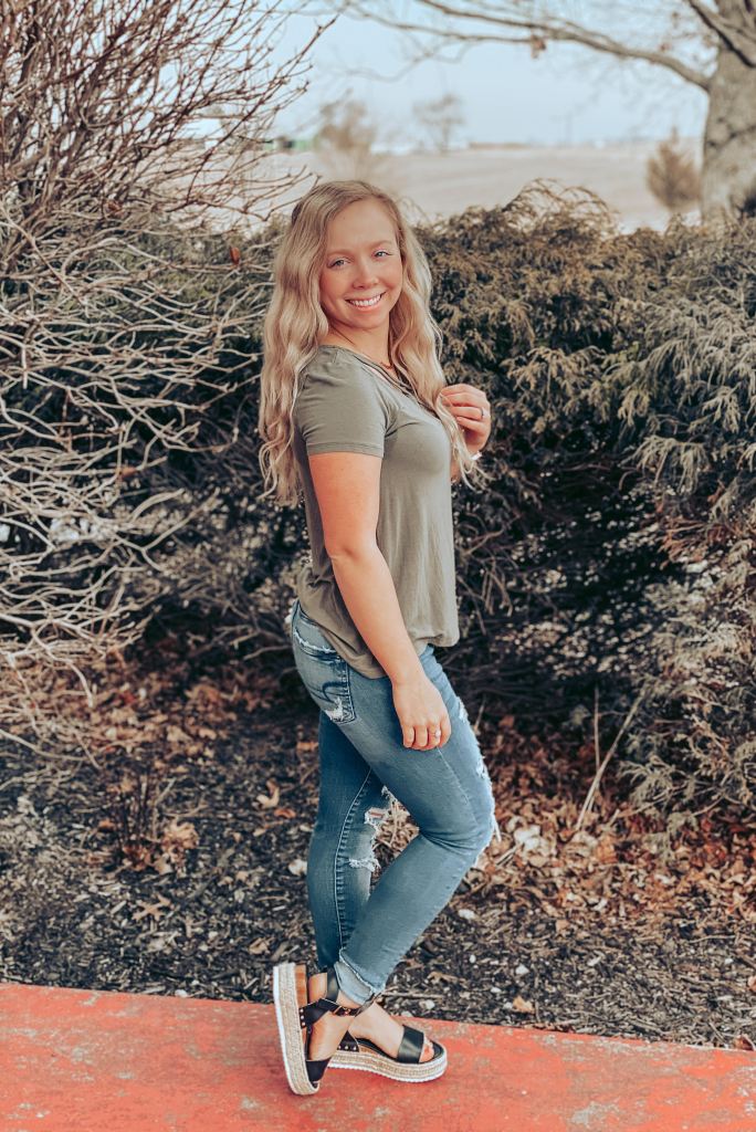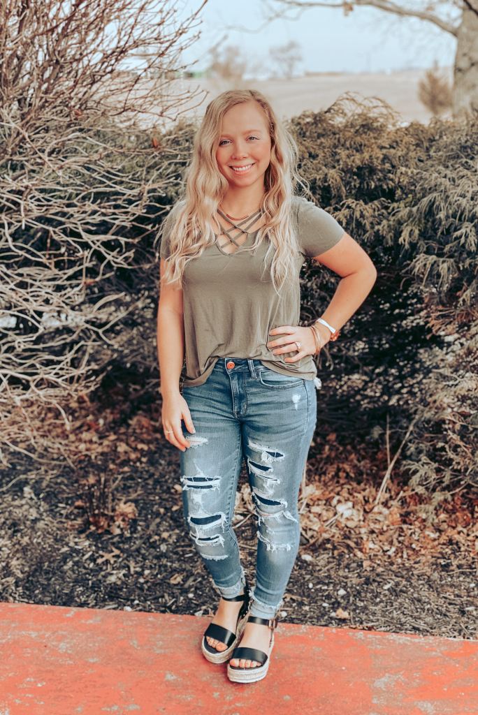 Who doesn’t love criss cross shirts?! So cute and fashionable! Another plus?? Forget to wear a necklace? No problem! If you don’t have a necklace to pair it with that’s ok because there is already a lot going on near the neck.